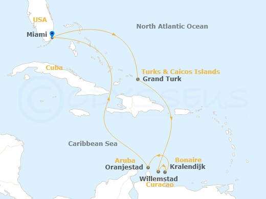 Miami, FL, USA | Grand Turk, Turks and Caicos Islands | Willemstad, Curacao | Kralendijk, Bonaire, St Eustatius and Saba | Oranjestad, Aruba | Miami, FL, USA